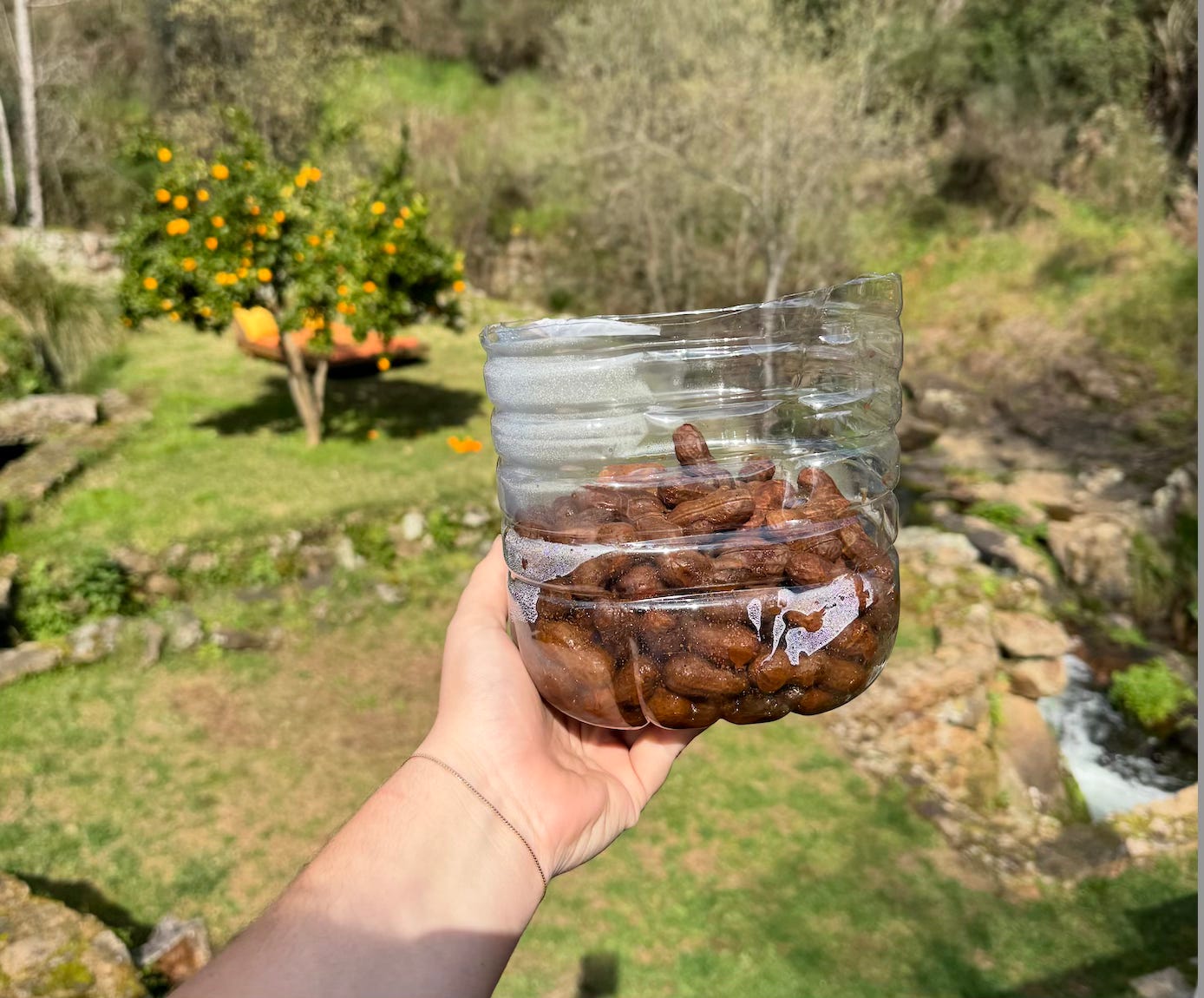 Last year, I was in a grocery store in Portugal, north of Lisbon, with my friend Alley. Beyond the rows and rows of salted cod, Alley found a bag of raw peanuts and we both knew immediately what we had to do. There was no Old Bay, so we settled on spicy paprika, sweet paprika, garlic powder, cayenne, salt, and pepper, and we forgot to buy beer so we used white wine instead. We cooked them back at the house and ate them outside by the stream. We couldn’t leave them behind on our way to Lagos, so we had to fashion a large water jug into a boiled peanut holder for the car ride.
